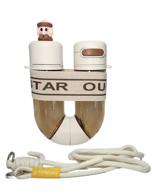 Termo plástico para dos bebidas, incluye cordon para colgar, pitillo, tapa en rosca.
