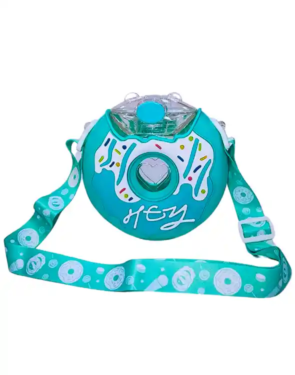 Termo plástico en forma de dona, internamente es de acero inoxidable, cierra bajo presión. Incluye correa para llevar.