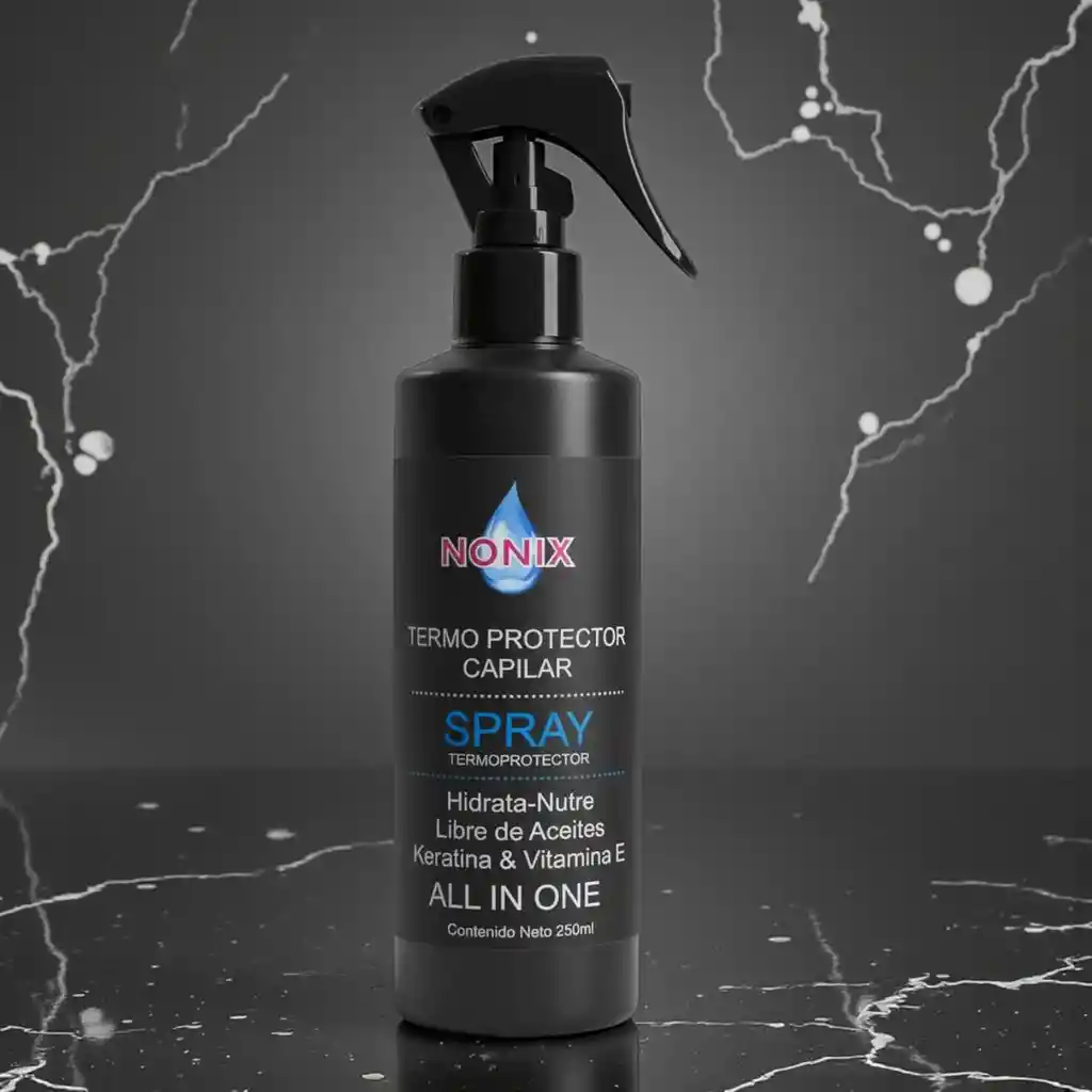 El spray termoprotector capilar NONIX "All in One" es la solución definitiva para el cuidado de tu cabello. Diseñado para proteger tu melena del calor, este innovador producto también hidrata y nutre en profundidad, dejando un acabado sedoso y saludable. Su fórmula avanzada, libre de aceites, está enriquecida con Keratina y Vitamina E, ingredientes esenciales que fortalecen la fibra capilar y aportan un brillo espectacular. Olvídate de múltiples productos; con NONIX, obtienes todos los beneficios en un solo y práctico envase de 250ml. Ideal para uso diario antes de cualquier herramienta de calor, este spray es un imprescindible para mantener un cabello radiante y protegido