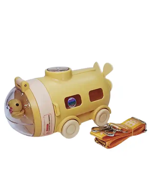 Termo plástico en forma de submarino con ruedas y helice decorativa, la tapa se puede abrir presionando el botón. Incluye correa para colgar.