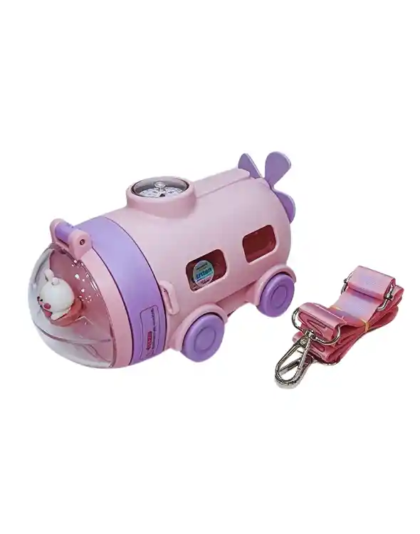 Termo plástico en forma de submarino con ruedas y helice decorativa, la tapa se puede abrir presionando el botón. Incluye correa para colgar.