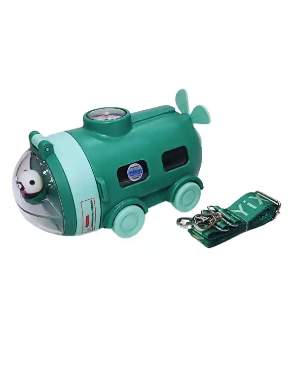 Termo plástico en forma de submarino con ruedas y helice decorativa, la tapa se puede abrir presionando el botón. Incluye correa para colgar.