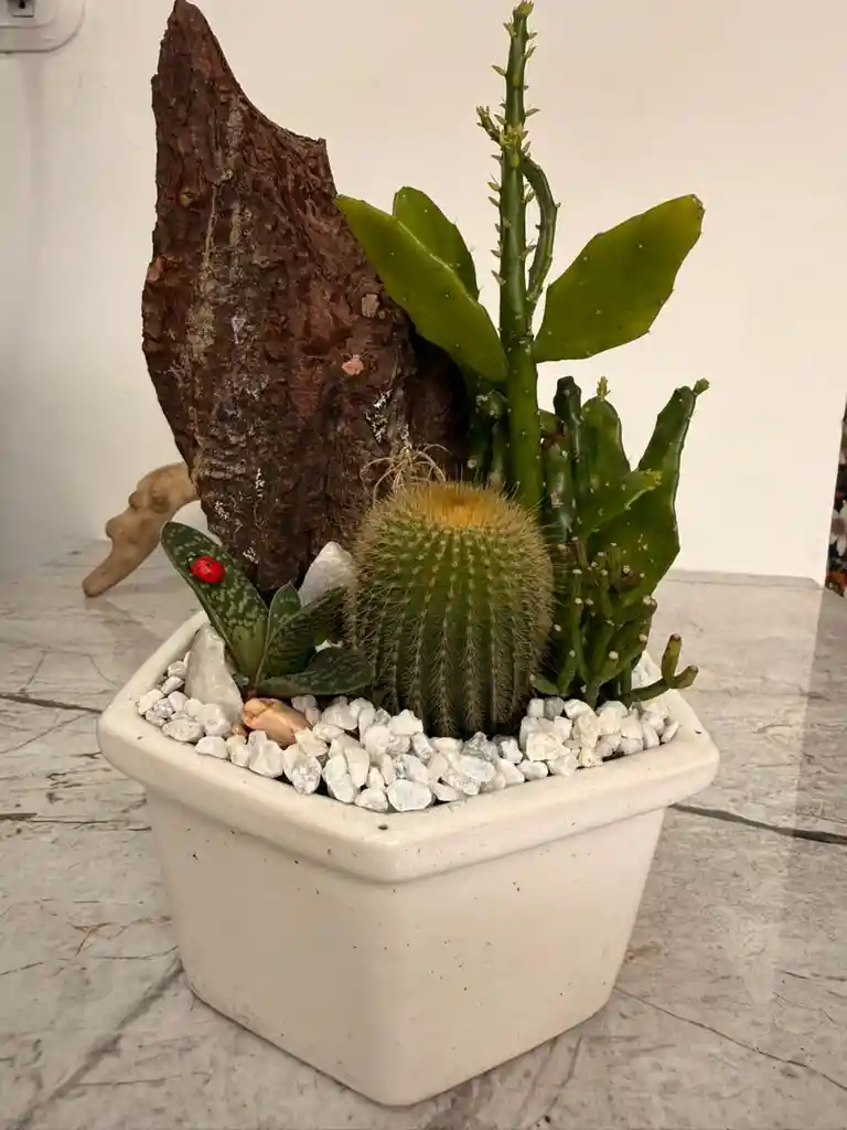 se distingue por un diseño cuidadoso, materiales de alta calidad y una selección experta de plantas, creando un paisaje desértico en miniatura que es estético y duradero.