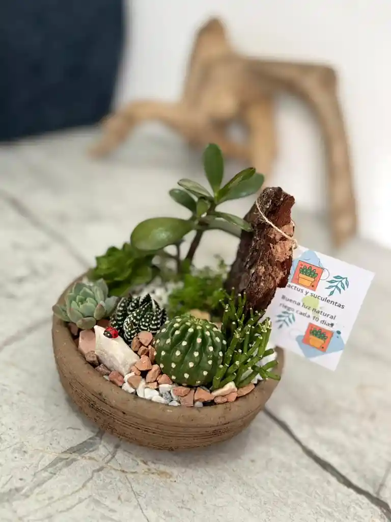 se distingue por un diseño cuidadoso, materiales de alta calidad y una selección experta de plantas, creando un paisaje desértico en miniatura que es estético y duradero.