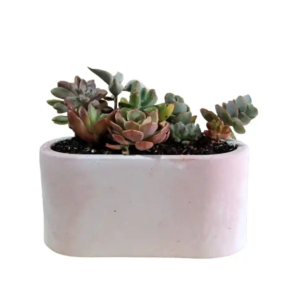 Este terrario de concreto incluye entre 6 y 7 suculentas variadas y mide 8cmx16.5cm (Especie de suculenta y color de la matera pueden variar según disponibilidad) Perfecto para Día de la mujer, Cumpleaños, Aniversario