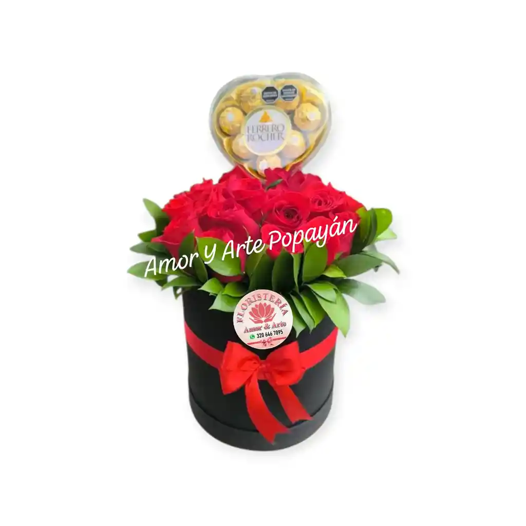 Sembrado en base de rosas rojas con chocolates ferrero. Incluye: moño, tarjea con mensaje personalizado, aroma, brillo.
