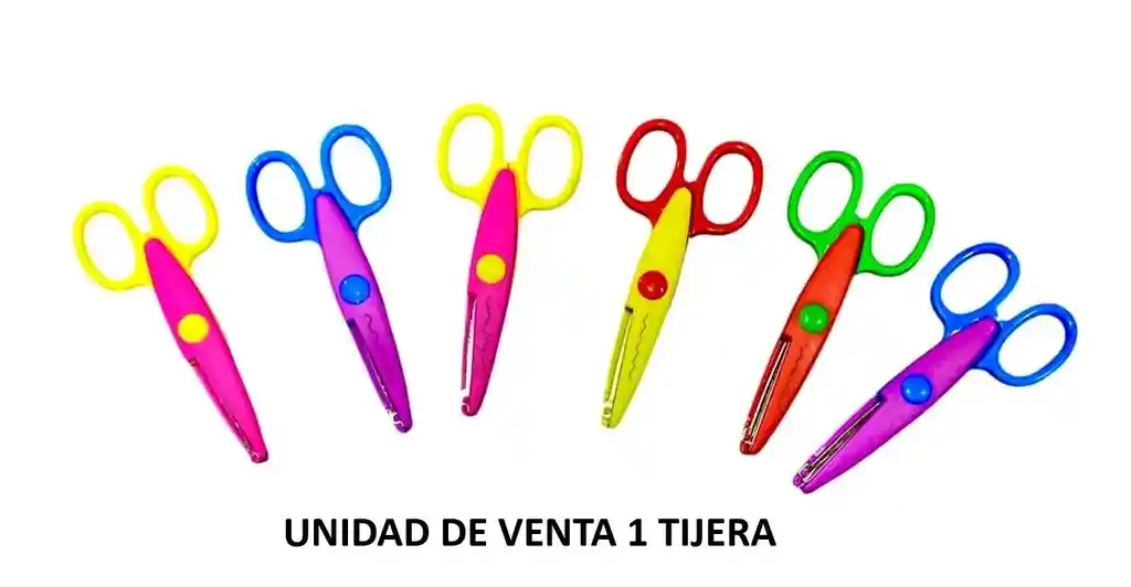 Tijeras plásticas con dientes metálicos para crear cortes divertidos en zig zag y ondulados en bordes de papel y tarjetas creativas! Personaliza tus agendas y cuadernos, Medidas 13 cm. Unidad de venta 1 tijera, se envia color segun disponibilidad