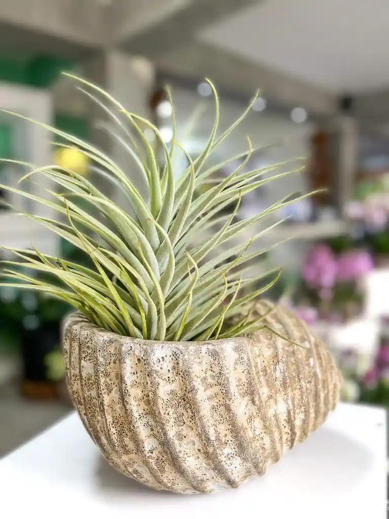 Tillandsia en maceta tipo concha Una pieza decorativa que combina la frescura natural de la Tillandsia con el encanto artesanal de una maceta inspirada en las texturas del mar. La Tillandsia, conocida como “planta de aire”, es una especie resistente y versátil que no requiere sustrato para vivir, lo que la convierte en una opción ideal para espacios modernos y con poco mantenimiento. Sus hojas estilizadas y plateadas aportan movimiento y luz, elevando cualquier ambiente con un toque natural y sofisticado. Ideal para oficinas, salas, estudios o como regalo especial gracias a su belleza única y su simbolismo: las Tillandsias representan libertad, adaptación y energía positiva, perfectas para quienes buscan armonía y renovación en su entorno. Nota importante Cada planta es única y puede presentar variaciones naturales en forma, tamaño o tonalidad. Si deseas que sea un regalo, por favor indícalo en el mensaje al momento de realizar tu pedido; incluiré decoración especial y una tarjeta personalizada sin costo adicional.
