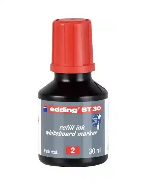 TINTA DE RECARGA EDDING BT30 BORRABLE 30 ml- Tinta para recargar con sistema dispensador por goteo, ideal para recargar rápidamente casi todos los marcadores edding para tableros blancos. El frasco de recarga de tinta contiene 30 ml. El rellenado es respetuoso con el medio ambiente, ya que reduce el desperdicio de materiales