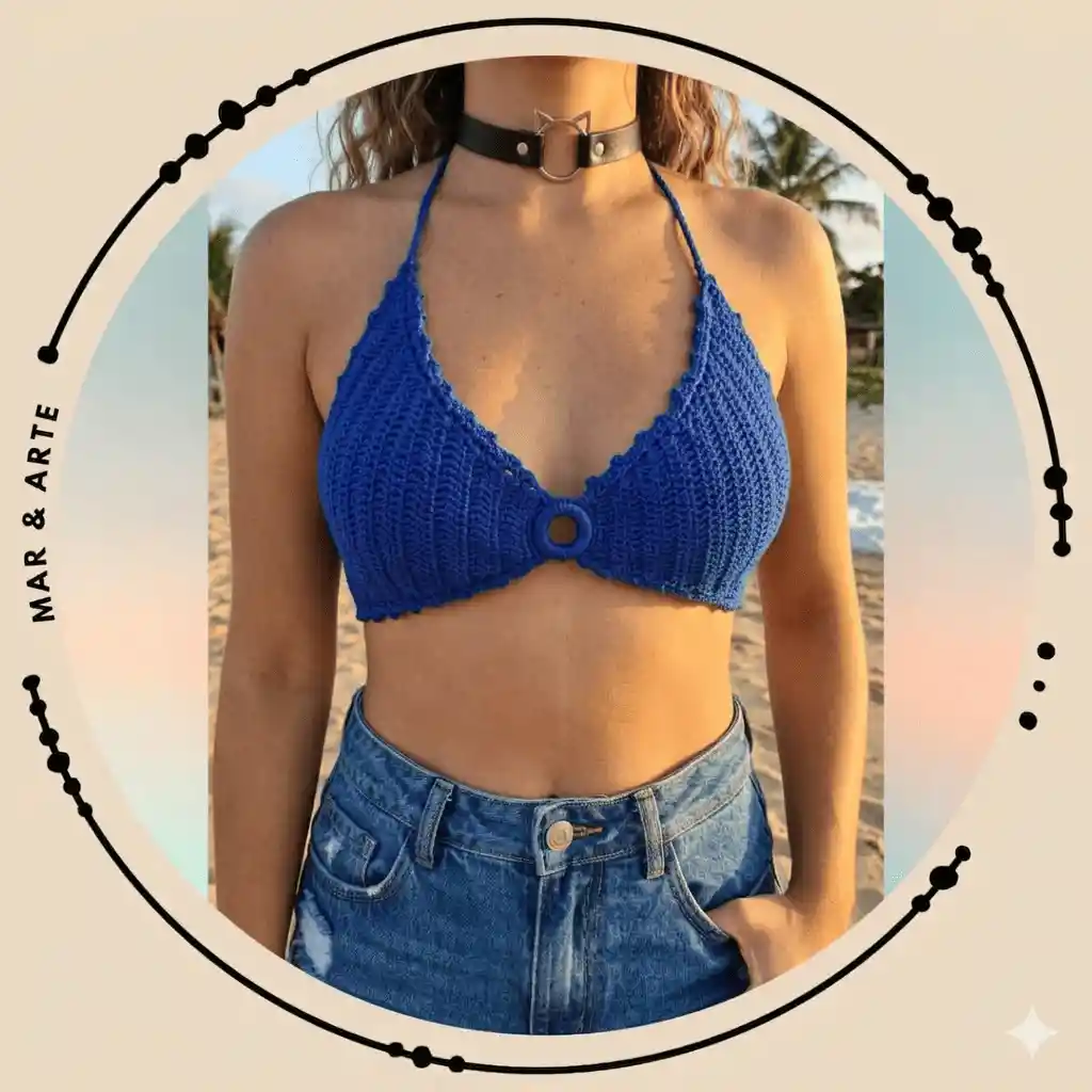 Top Azul tejido a crochet estilo strapless 100% hilo acrílico e hipoalergénico