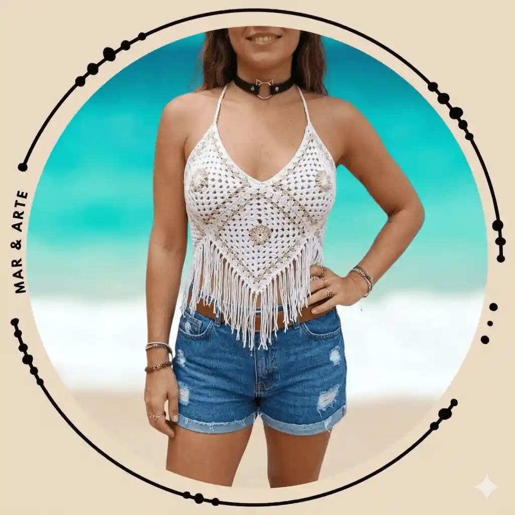 Top de grannys en blanco y beige con detalle de flecos 100% hilo acrílico e hipoalergénico
