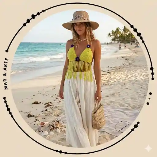Top tejido a crochet con flores y flecos color amarillo intenso