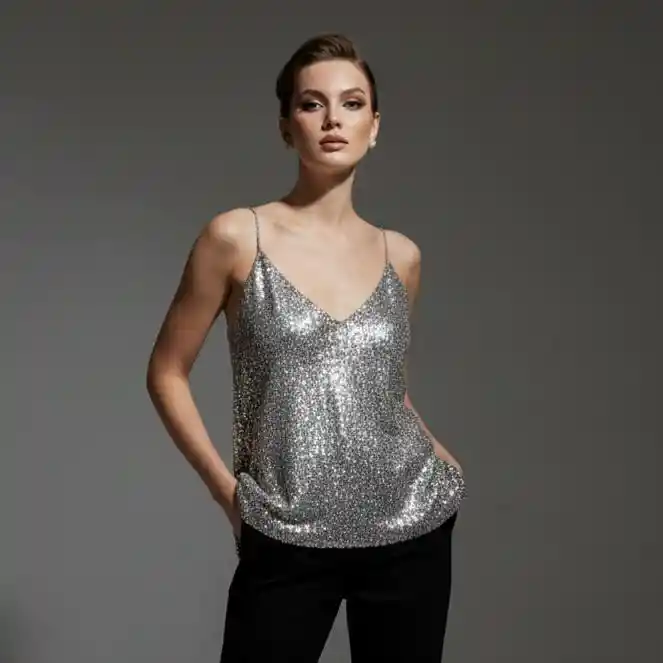 Top de Lentejuelas Gris Un top casual con actitud. Su base relajada se combina con una cobertura completa de lentejuelas grises que lo convierten en una pieza llamativa y versátil al mismo tiempo. Es perfecto para quienes quieren brillar sin perder comodidad. Puedes combinarlo con jeans para un contraste urbano o con prendas más estructuradas para un look nocturno. Es ese equilibrio entre sencillo y protagonista.