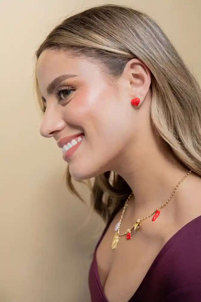 Aretes elaborados en Acero con baño de oro de 24k pintados en resina. Incluye: 1 par de topos corazon rojo. Recibe con tu compra una FLORIBAG gratis, para que guardes por separado tus accesorios. Hecho a mano en Colombia. * Las imágenes pueden estar ambientadas con otros productos que se venden por separado