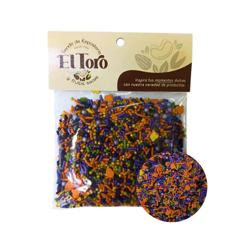 TOPPINGS O LLUVIA DE HALLOWEEN CALABAZAS 50 G Basta con esparcir sobre la superficie deseada o usarlo en la decoración de los dulces, tortas, helados, donuts, pasteleria, postres entres otros.