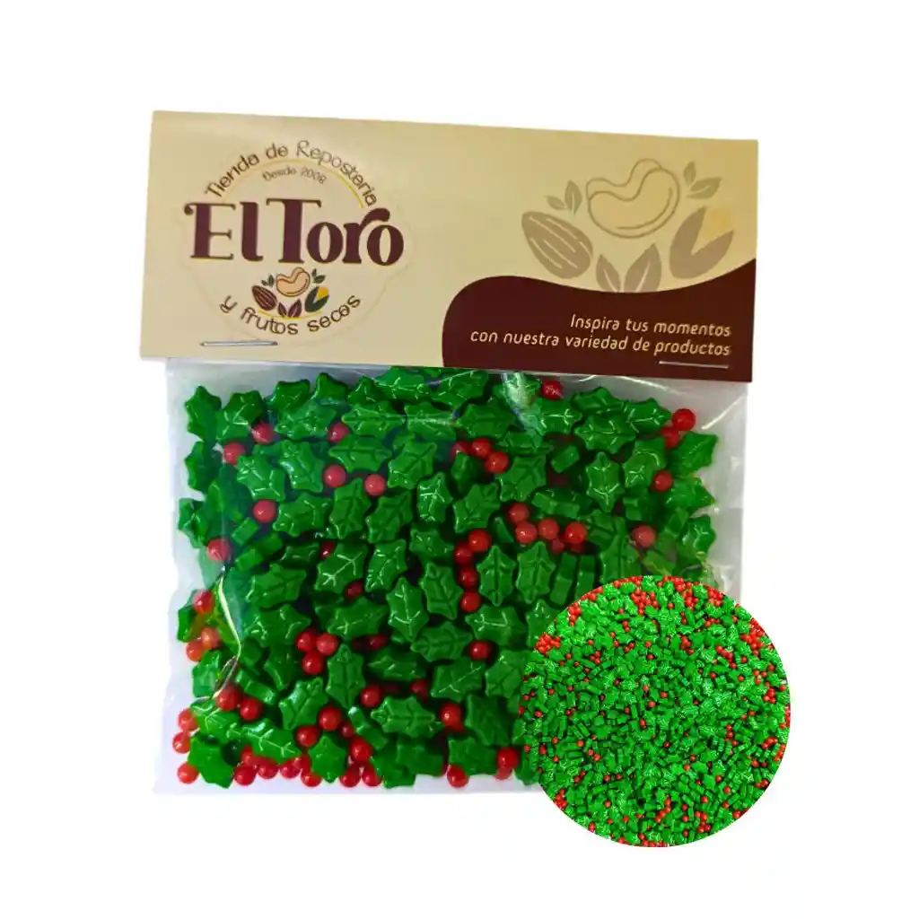 TOPPINGS O LLUVIA DE HOJAS DE NAVIDAD 50 G Basta con esparcir sobre la superficie deseada o usarlo en la decoración de los dulces, tortas, helados, donuts, pasteleria, postres entres otros.