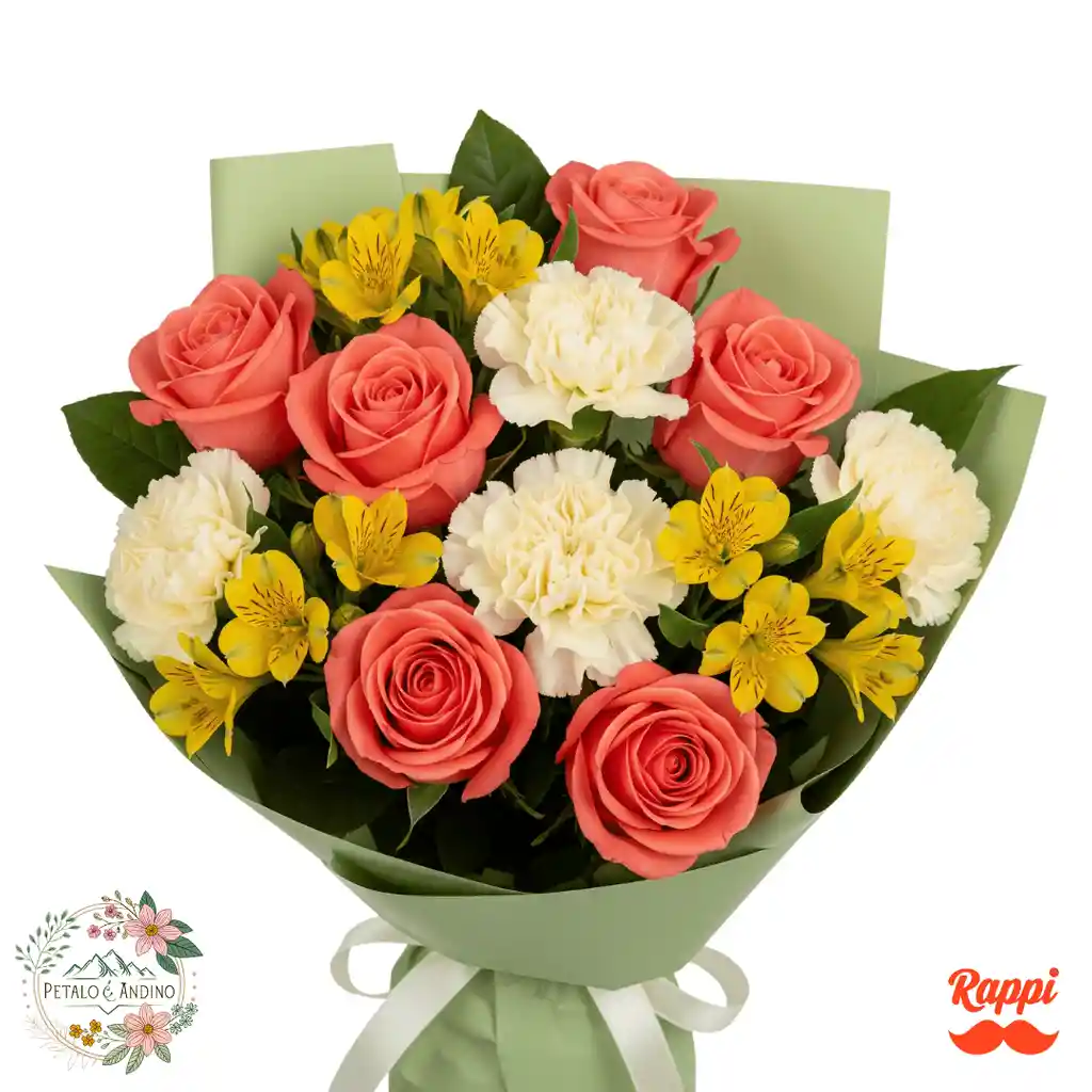 Este encantador ramo es una mezcla armoniosa de colores cálidos y suaves. Presenta exquisitas rosas color salmón que evocan un atardecer, complementadas con la pureza de los claveles blancos y la alegría de las astromelias amarillas. Envuelto en un papel verde menta y atado con una cinta blanca, este ramo transmite una sensación de dulzura y alegría, ideal para cualquier ocasión especial. Flores: 6 Rosas color salmon Claveles blancos Astromelias