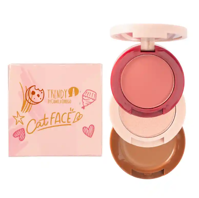3 infaltables en un compacto y práctico empaque de pisos. Así es el nuevo Cat Face, contiene un rubor en tono rosita durazno para tus mejillas, un iluminador en tono oro rosa perfecto para utilizar como iluminador y un bronzer en crema en tono universal. Su textura es suave y ligera. Se adaptan a todos los tipos de piel. Tienen buena adherencia y duración. Aplícalos con brocha para darles mayor pigmentación. Incluye un práctico espejo de alta definición para que puedas ver y retocar tu maquillaje cuando lo necesites. Recuerda sellar el bronzer con polvo traslúcido o un bronzer en polvo, así aseguras mayor duración. Puedes utilizar el rubor en tono rosita sobre un rubor en crema para sellarlo y darle mayor pigmentación.