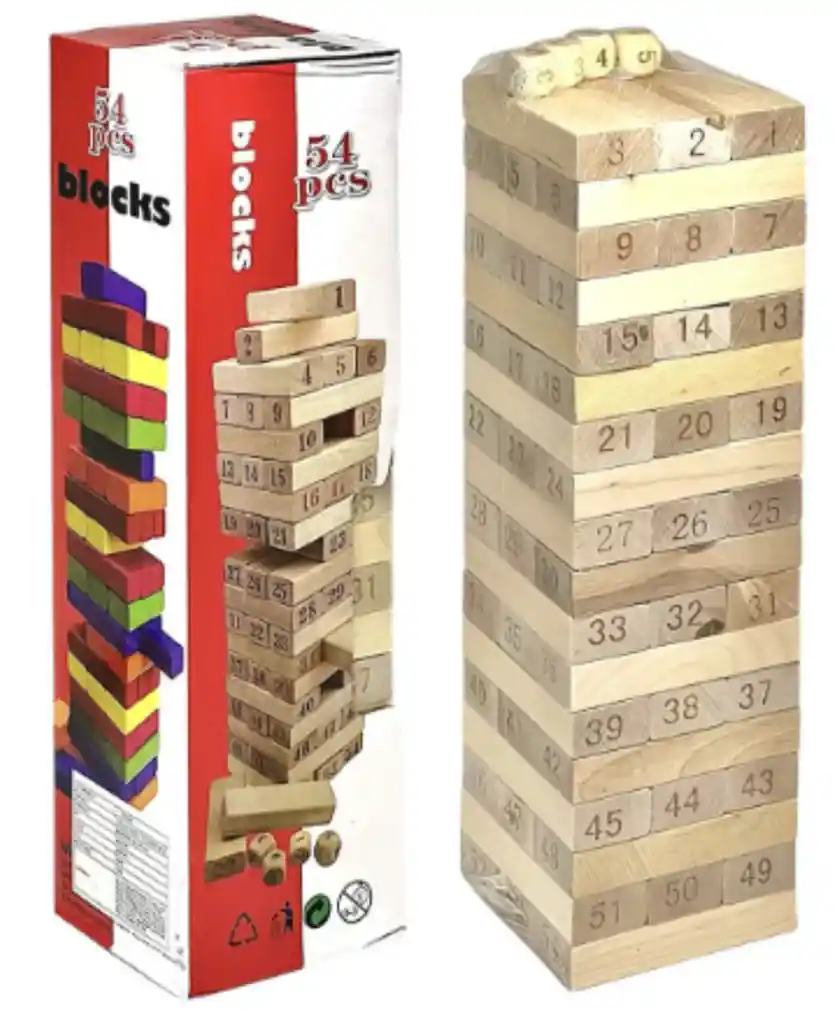 EL BAÚL DE MATIAS La Jenga es un entretenido y emocionante juego de mesa de integración, en el cual practicarás tus habilidades de concentración, equilibrio y pulso. Para jugar solo debes lanzar los dados y de acuerdo al número que estos marquen debes sacar un bloque, evitando que los demás se derrumben. En este juego en particular no hay un solo ganador, si no un solo perdedor, el que derrumbe la torre primero. CARACTERÍSTICAS Material : Madera pulida color natural. Medidas : ALTURA: 29 CM X ANCHO: 8 CM Incluye: 54 Bloques y 4 dados, toda fabricada en madera. Marca : Blocks