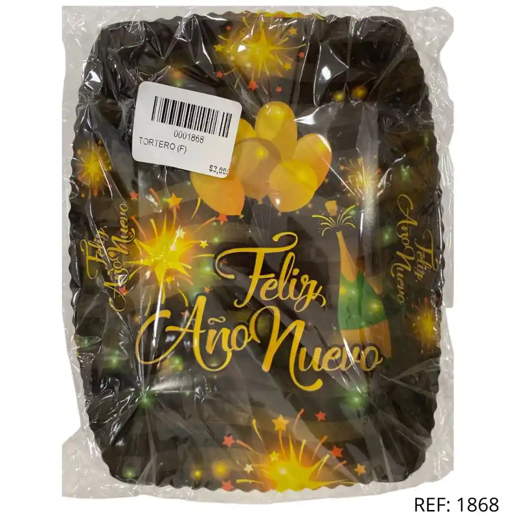 Plato desechable tortero “Feliz Año Nuevo” con diseño elegante en fondo negro, fuegos artificiales dorados y botella de champán. Ideal para servir tortas y postres en celebraciones de Nochevieja
