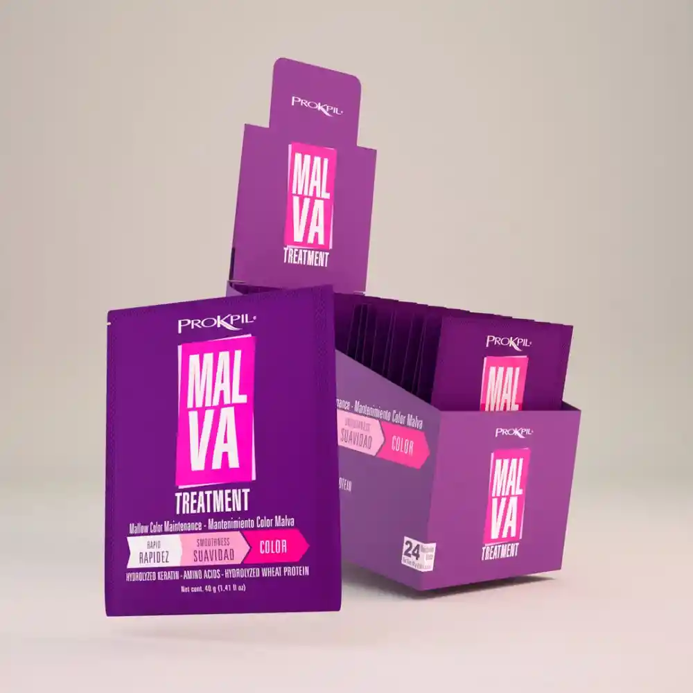 Tratamiento Mantenimiento Color Malva Mantiene el color del cabello teñido, evitando que aparezcan los tonos de desgaste, que se generan por los lavados o exposición al ambiente, al mismo tiempo que mejora la hidratación, el brillo y la suavidad del cabello. Esta línea está compuesta por 9 colores, creados como una solución a los diferentes tonos de tinturas. Este producto no es permanente Adecuado para cabellos teñidos Libre de parabenos ● No testeados en animales MODO DE USO Lava el cabello con Shampoo Color Care o Cenizo de Prokpil, retira con abundante agua, eliminar el exceso de agua con la toalla, aplica el tratamiento color de acuerdo al tono mechón a mechón para lograr una aplicación uniforme. TIEMPO DE EXPOSICIÓN **APLICA PARA RUBIOS Esperar de 2 a 10 minutos. (A mayor altura menos tiempo y a menor altura más tiempo) **APLICA PARA DEMÁS TONOS Esperar de 10 a 15 minutos. Retirar con abundante agua. Repetir cada tercer lavado.