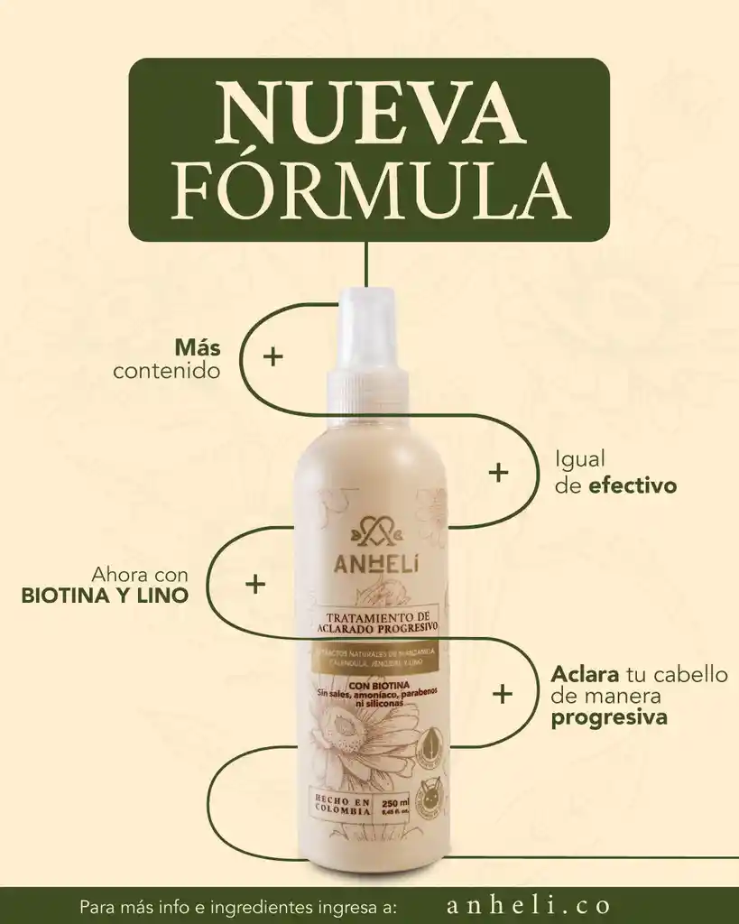 Aclara tu cabello de manera progresiva con el Tratamiento de Aclarado Anhelí, una fórmula única que aclara hasta 4 tonos, aporta brillo, controla el frizz y estimula el crecimiento capilar. Su combinación de manzanilla, caléndula y jengibre permite obtener un aclarado visible, logrando un efecto natural. ¿Por qué lo amarás? Tú controlas el proceso de aclarado. Ahorra tiempo y dinero en el salón de belleza. Empareja la raíz oscura con el resto del cabello. Disimula canas sin necesidad de tintes. Permite lograr un efecto balayage aplicando de medios a puntas. Aporta múltiples beneficios mientras nutre y fortalece. Producto avalado por INVIMA. Beneficios clave Aclarante natural | Anti-frizz | Estimula el crecimiento Modo de uso Agita antes de usar. Rocía 1 a 2 veces por zona y distribuye con un peine. No requiere enjuague. Una vez logres el tono deseado, solo retoca las raíces cuando crezcan. No necesita exposición al sol ni calor para funcionar. Preguntas frecuentes ¿En cuánto tiempo se ven los resultados? Depende del tono base y los procesos previos del cabello. El 90% de nuestras clientas nota cambios entre la primera y la cuarta semana de uso diario. En cabellos muy oscuros el proceso puede tardar un poco más. Si dejo de usar el tratamiento, ¿pierdo el tono obtenido? No. El tono se mantiene únicamente crecerá la raíz con tu color natural. Para mantener el color uniforme, aplica una o dos veces por semana sobre la raíz. ¿Puedo aplicarlo si tengo tinte o alisado (keratina)? Sí. Su fórmula libre de sales, sulfatos y parabenos no afecta procesos químicos ni de alisado. ¿Se aplica en cabello húmedo o seco? Puede aplicarse en ambos. Lo importante es no enjuagarlo inmediatamente después. Es un producto versátil que se adapta fácilmente a tu rutina capilar. Contenido: 220 ml Duración aproximada: 4 a 6 semanas Rutina: Día o noche