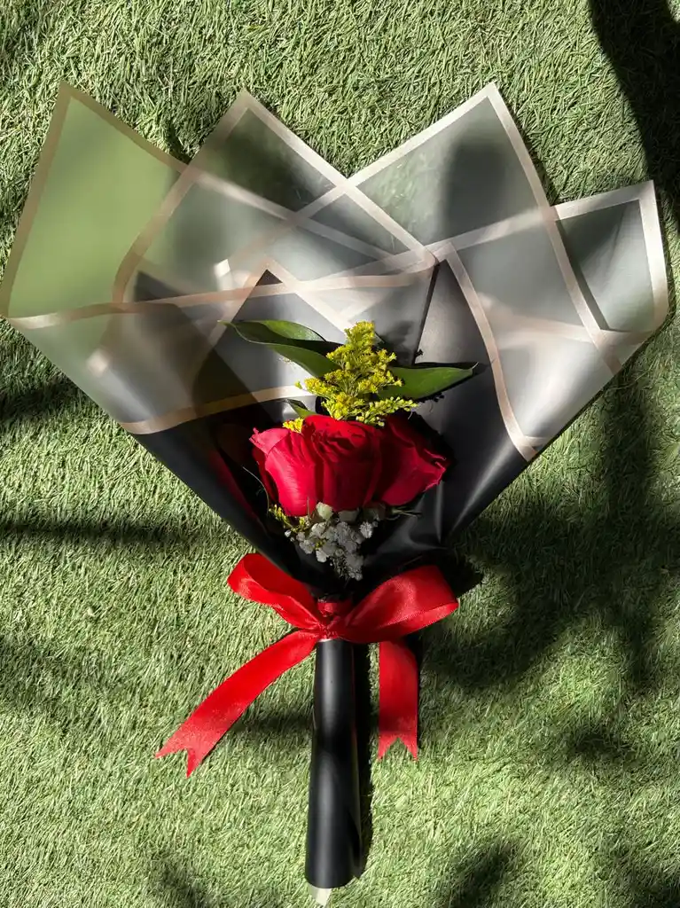 Hermoso arreglo de tres rosas decoradas con detalles elegantes que resaltan su color y frescura. Un detalle clásico y romántico para cualquier ocasión. 🌹