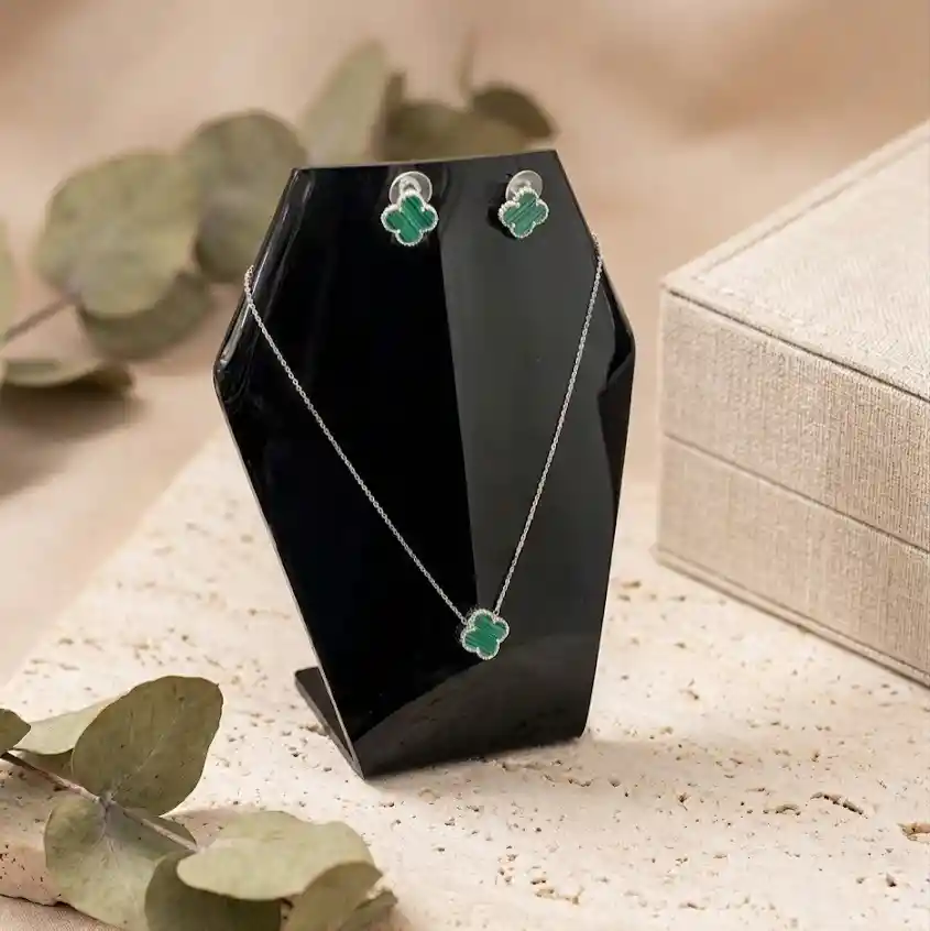 ✨ Trío Plata Ley 925 Trebol Verde con Brillos + Estuche de Lujo ✨ Luce un estilo elegante y lleno de significado con este hermoso trío en plata ley 925 con diseño de trébol verde, símbolo de buena suerte y armonía. ✨ Características destacadas: 💎 Elaborado en plata ley 925 original de alta calidad 🍀 Diseño de trébol verde con detalles brillantes 💖 Incluye trío completo: cadena, dije y aretes 🎁 Estuche de lujo ideal para regalo 🌟 Acabado brillante