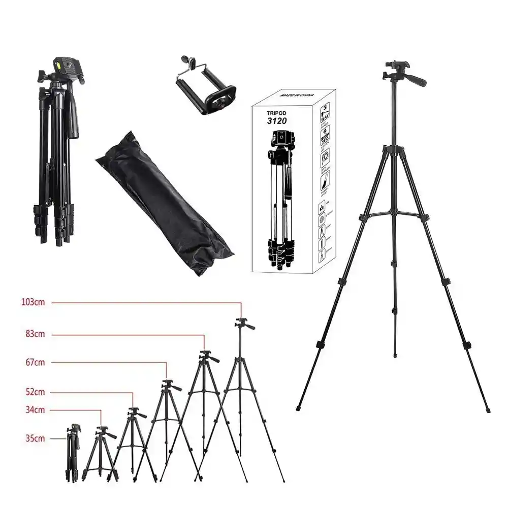 Es compatible con cámaras y celulares. Fabricado con aleación de aluminio ligero y plástico. Altura máxima ajustable de hasta 1.02 metros. Incluye cabezal panorámico para movimientos suaves y un nivel de burbuja para asegurar capturas niveladas.