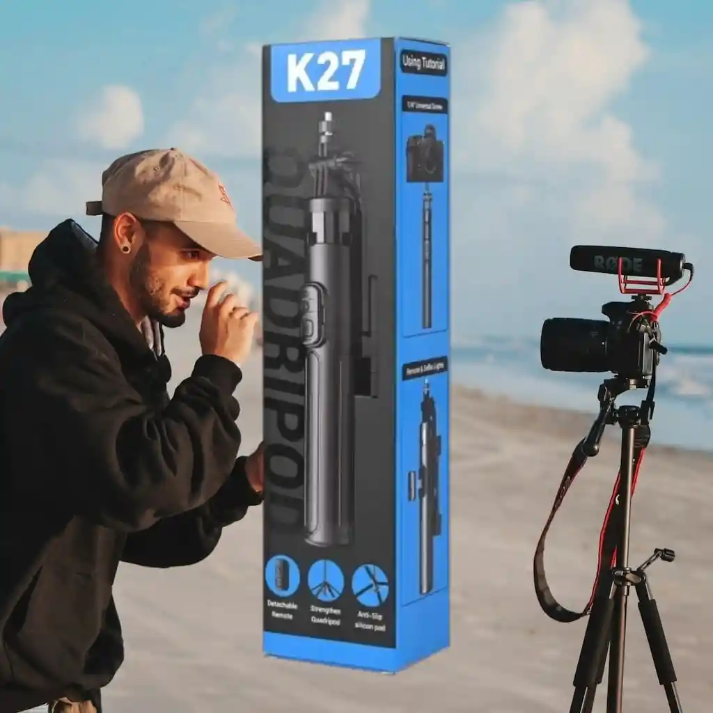Captura fotos y videos estables desde cualquier ángulo con el Trípode Selfie Stick K27, un accesorio versátil diseñado para creadores de contenido, videollamadas, transmisiones en vivo y fotos grupales. Su diseño 2 en 1 funciona como selfie stick y trípode, permitiéndote mayor comodidad y estabilidad. Incluye control remoto Bluetooth desmontable, ideal para tomar fotos a distancia sin tocar el celular. Cuenta con patas antideslizantes que brindan mayor firmeza en diferentes superficies y un sistema plegable y ligero, perfecto para llevar a cualquier lugar. Características destacadas: Modelo: K27 Altura 130cm Función 2 en 1: selfie stick + trípode Control remoto Bluetooth desmontable Altura ajustable Diseño compacto y portátil Patas con base antideslizante Ideal para fotos, videos, streaming y videollamadas