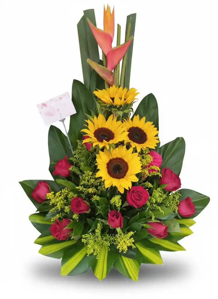 ✨ Tu Mensaje, Hecho Flor: La Elegancia de Loren’s ✨ En Loren’s Floristería, cada diseño es una obra de arte pensada para ti. Este majestuoso arreglo es la prueba: la radiante alegría de los Girasoles se entrelaza con la pasión de las Rosas Rojas y la sofisticación exótica eliconio. ¿El resultado? Un regalo inolvidable, tan vibrante como tus sentimientos.