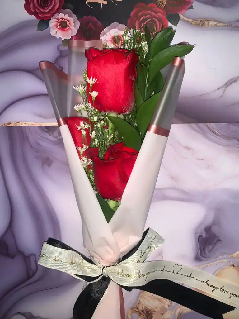 Ramo romantico elaborado con 3 rosas premiun acompañado de delicadas florecitas blancas y follaje verde.