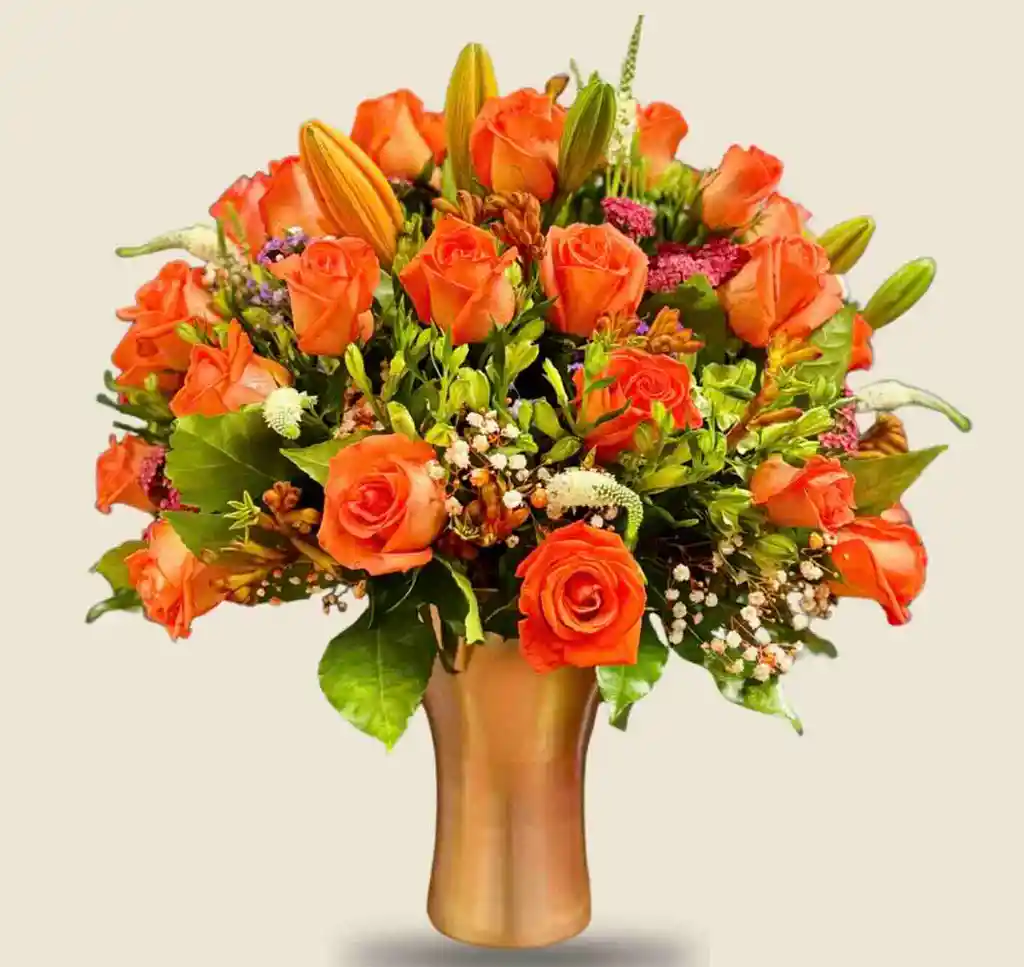 12 rosas naranjas, acompañadas de follajes verdes y blancos en un florero campana de color dorado