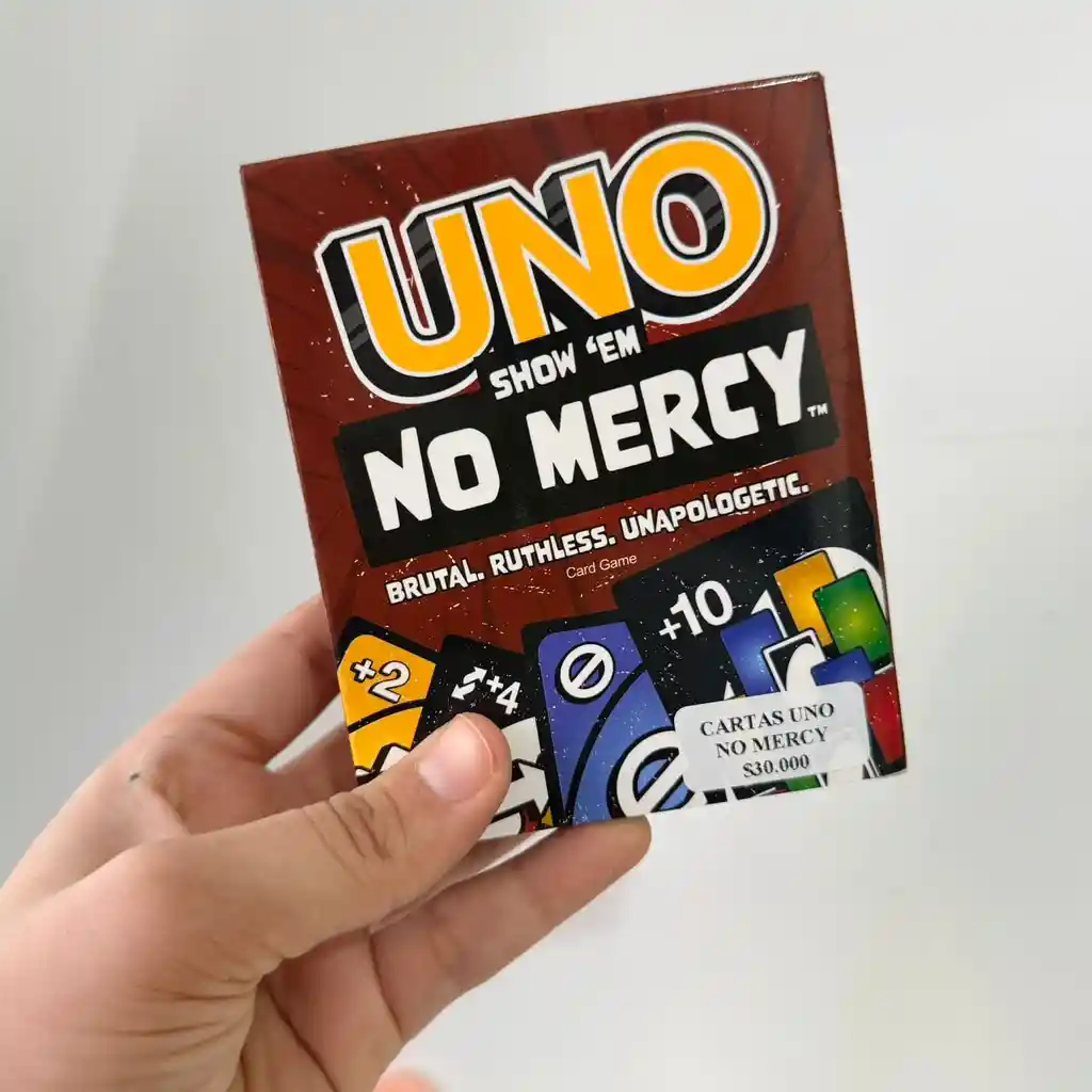 UNO es un clásico juego de cartas ideal para disfrutar en familia o con amigos bastante conocido, en esta ocasión llega una variante del juego llamada UNO No Mercy Deluxe o «sin piedad» El juego cuenta con 168 cartas, 60 mas que la baraja tradicional, la forma de jugar es igual pero cambian algunas reglas de juego, gracias a 4 nuevos comodines, reversa toma 4, toma 6, ruleta de color y toma 10, que aumentan la competitividad, reglas y adrenalina al momento de jugar, de ahí deriva su nombre.