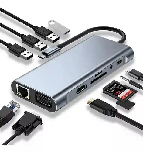 -Descripción-- Hub USB C, adaptador USB C 11 en 1 con 4K HDMI, VGA, tipo C PD, USB3.0, RJ45 Ethernet, lector de tarjetas SD/TF, auxiliar de 0.138in, estación de acoplamiento compatible con MacBook Pro/Air, otros dispositivos portátiles tipo C -Gestiona todo en uno USB-C Hub: el adaptador USB C Hub es compatible con todos los dispositivos que contienen puertos tipo C / USB, especialmente MacBook Pro y Air. El concentrador USB C 11 en 1 incluye un puerto USB 3.0 y tres puertos USB 2.0, un puerto PD, una salida de video HDMI 4K, un puerto VGA macho a hembra, un puerto Ethernet RJ45 y una salida de audio, y ranuras para lector de tarjetas SD/Micro SD, compatible con MacBook Pro / Air, Chromebook y otros dispositivos tipo C. ,-Transferencia de datos super rápida: los puertos USB 3.0 soportan velocidades de transferencia de hasta 5 Gbps, 2 USB 2.0 para mouse inalámbrico y teclado de 2.4 G sin interferencias de seal. La ranura SD/TF puede acceder a archivos en unos segundos. El puerto Ethernet RJ45 de 328.1ft proporciona un acceso a Internet ms estable y rápido que la mayora de las conexiones inalámbricas. (Nota: adaptador USB C. No puede leer la tarjeta SD/TF al mismo tiempo) , -HDMI 4K y VGA: la estación de acoplamiento USB C soporta altas resoluciones de hasta 4K 3840 x 2160 30 Hz y transmite videos 4K o Full HD 1080p directamente a HDTV, monitores o proyectores y es compatible con resoluciones 2K / 1080p / 720p. El puerto VGA soporta hasta 1080P 60HZ. -Tecnología de doble núcleo, carga rápida PD: el adaptador multipuerto USB C Hub se combina con el chip de doble núcleo integrado, que tiene un menor consumo de energía, todos los puertos pueden funcionar de manera eficiente y la velocidad de transmisión de datos se vuelve ms rápida. El dongle USB C soporta hasta 100 W de carga rápida.