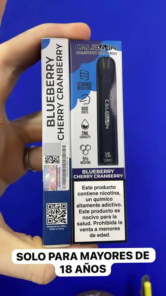 Instrucciones de uso El Uwell Caliburn Bar 800 Hits es un dispositivo desechable, precargado y listo para usar. No requiere configuración ni recarga de líquido. 1. Retire el dispositivo del empaque y quite los protectores de silicona de la boquilla y la base (si los incluye). 2. El dispositivo no tiene botones se activa automáticamente al inhalar por la boquilla. 3. Realice inhalaciones suaves y moderadas de 2 a 3 segundos. 4. Espere algunos segundos entre cada calada para evitar el sobrecalentamiento interno. Este modelo no es recargable ni rellenable. Una vez se agote el líquido o la batería, el dispositivo debe desecharse. ________________________________________ Vida útil del producto El dispositivo está diseñado para ofrecer aproximadamente 800 caladas (hits), dependiendo de la duración y frecuencia de uso. La duración estimada puede variar: • Uso leve: varios días. • Uso moderado: 2 a 4 días. • Uso intensivo: 1 a 2 días. Factores como inhalaciones largas, uso continuo sin pausas o exposición al calor pueden reducir su vida útil. El producto se considera finalizado cuando: • Disminuye significativamente la producción de vapor. • Se percibe sabor quemado persistente. • No se genera vapor al inhalar. Al tratarse de un dispositivo desechable con batería integrada, no permite recarga ni mantenimiento interno. ________________________________________ Advertencias de seguridad y almacenamiento Este dispositivo contiene batería interna y líquido con nicotina. • No abrir, perforar, aplastar ni modificar el dispositivo. • No exponer a temperaturas elevadas, fuego o luz solar directa. • No mojar ni sumergir en agua. • Mantener fuera del alcance de niños y mascotas. • No utilizar si presenta daños físicos, fugas o sobrecalentamiento. Para almacenamiento adecuado: • Conservar en lugar fresco, seco y ventilado. • Temperatura recomendada: entre 15 °C y 25 °C. • Evitar dejarlo dentro de vehículos o en zonas húmedas. Una vez finalizada su vida útil, debe desecharse conforme a la normativa local de residuos electrónicos debido a su batería interna. ________________________________________ Garantía del producto El producto cuenta con garantía limitada por defectos de fábrica, aplicable únicamente a fallas de funcionamiento inicial, tales como: • El dispositivo no produce vapor desde el primer uso. • No se activa al inhalar estando recién abierto. La garantía no cubre: • Desgaste normal por uso. • Producto agotado (cuando se terminan las 800 caladas). • Daños por golpes, caídas o manipulación indebida. • Exposición a líquidos o calor extremo. Para hacer efectiva la garantía, el cliente debe reportar la novedad de inmediato, presentando el producto en buen estado físico y con su empaque original. Una vez verificada la falla de fábrica, se procederá con cambio del producto según disponibilidad. La garantía es de carácter personal, no transferible y no aplica cuando el dispositivo ha sido abierto, alterado o utilizado de forma indebida.