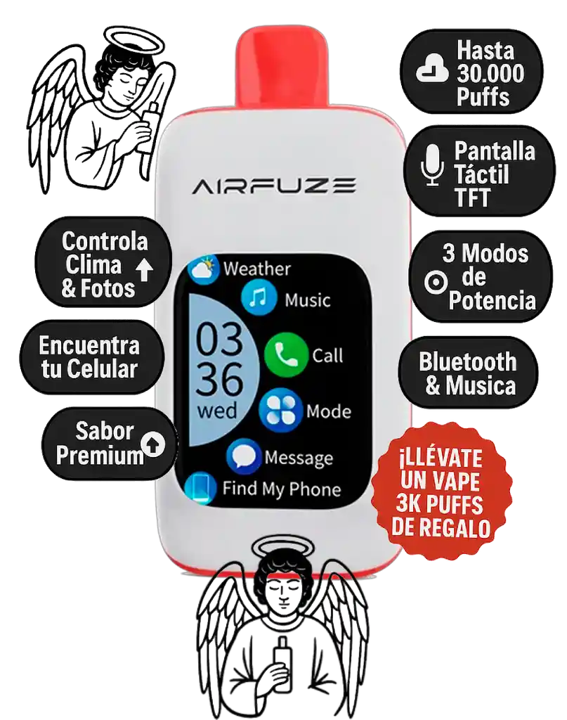 Explosión ácida y dulce de gomitas sour con toque fresco de sandía. El Airfuze Smart 30K ofrece hasta 30,000 caladas y tecnología inteligente para una experiencia única. 🔹 Sabor: Gomitas sour con notas de sandía 🔹 Duración: Hasta 30,000 caladas (modo normal) / 15,000 caladas (modo turbo) 🔹 Capacidad de e-líquido: 20 ml 🔹 Nic.: 5% (50 mg) 🔹 Batería: 900 mAh recargable USB Tipo-C 🔹 Pantalla táctil 2.01" TFT a color: Muestra nivel de batería, e-líquido, modo de potencia, contador de caladas y notificaciones inteligentes 🔹 Modos de potencia: Suave (12W), Normal (18W) y Turbo (25W) 🔹 Conectividad Bluetooth: Para llamadas, música y control vía smartphone 🔹 Activación: Por inhalación, sin botones ¡Vapeá sabor, tecnología y control total en cada calada! 🍬💨