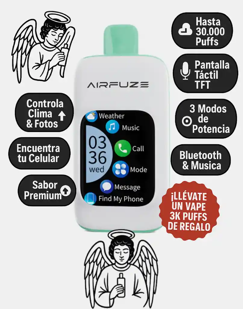 💨 Puffs: Hasta 30,000 caladas para disfrutar sin preocuparte por recargas constantes. ⚙️ Funciones inteligentes: ✅Micrófono para llamadas ✅ Pantalla TFT táctil ✅ Bluetooth & Música para conectar tu playlist favorita ✅ Control de Clima & Fotos ✅ Modos de potencia ajustables 🍉🫐 Sabor: Fusión dulce y refrescante de arándano y sandía, ideal para quienes buscan un toque frutal, jugoso y vibrante en cada puff. 👌 Perfecto para: Vapear con estilo y tecnología, sin perder la frescura. Para quienes aman sabores frutales con un final suave y equilibrado.