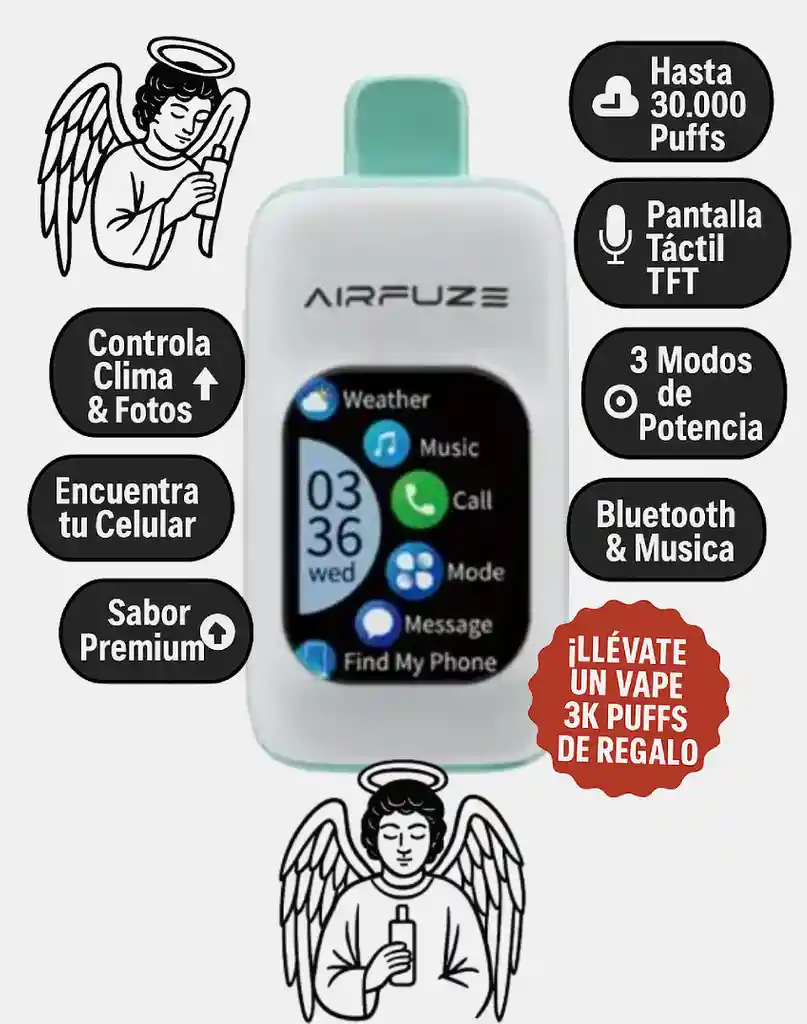 💨 Puffs: Hasta 30,000 caladas para disfrutar sin preocuparte por recargas constantes. ⚙️ Funciones inteligentes: ✅Micrófono para llamadas ✅ Pantalla TFT táctil ✅ Bluetooth & Música para conectar tu playlist favorita ✅ Control de Clima & Fotos ✅ Modos de potencia ajustables 🍉🫐 Sabor: Fusión dulce y refrescante de arándano y sandía, ideal para quienes buscan un toque frutal, jugoso y vibrante en cada puff. 👌 Perfecto para: Vapear con estilo y tecnología, sin perder la frescura. Para quienes aman sabores frutales con un final suave y equilibrado.