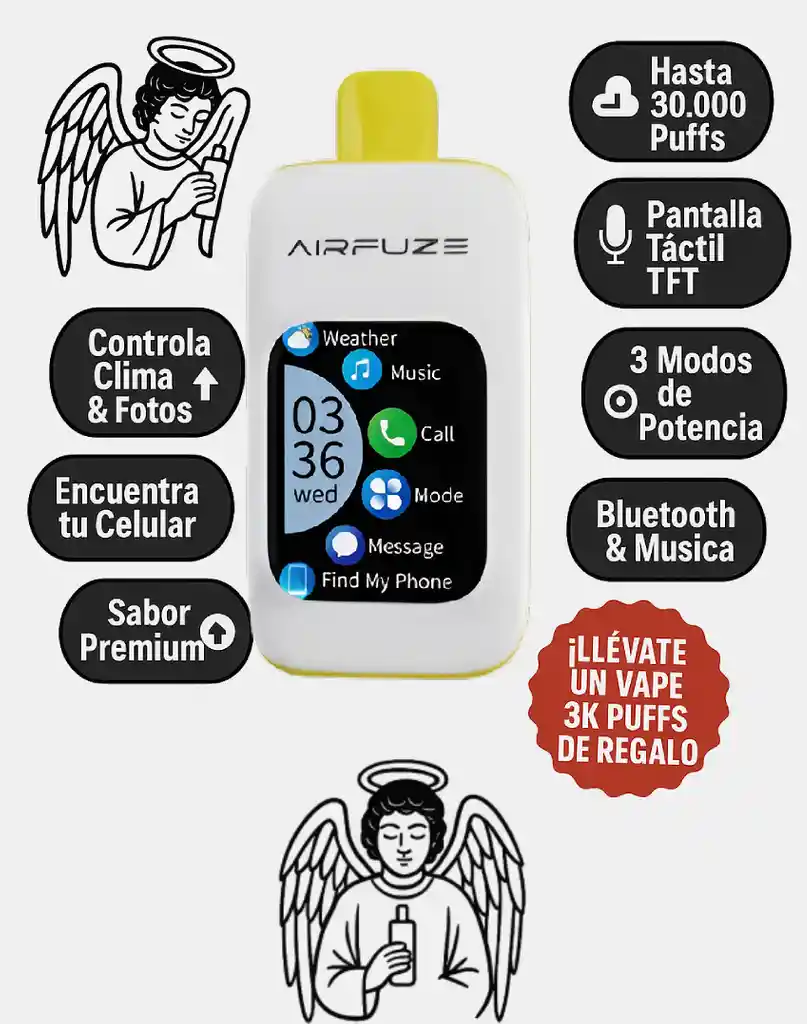 💨 Puffs: Hasta 30,000 caladas de sabor cremoso y tropical. ⚙️ Funciones inteligentes: 🎙️ Micrófono para llamadas ✅ Pantalla TFT táctil ✅ Bluetooth & Música para vapear con flow ✅ Control de Clima & Cámara para selfies con estilo ✅ 3 Modos de potencia para personalizar la experiencia 🍓🍌 Sabor: Una mezcla sedosa de fresa madura y plátano cremoso. Cada puff ofrece un balance perfecto entre la dulzura frutal y una suavidad envolvente, ideal para quienes aman los sabores postres sin ser empalagosos. 👌 Perfecto para: Los que buscan una experiencia dulce, suave y tropical. Ideal para momentos de relax, tardes de música o simplemente para disfrutar de un vape inteligente y lleno de estilo.