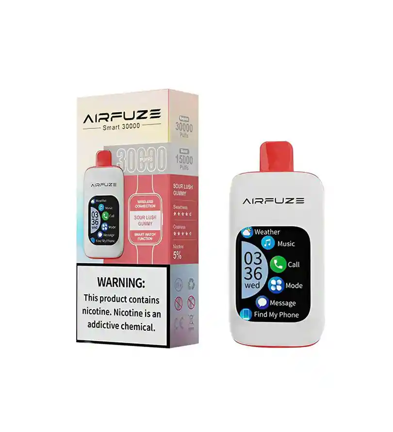 Sour Lush Gummy: Gomitas de sandía ácidas con un toque frío El Airfuze Smart 30k es un vape desechable de alta gama de 30,000 Puffs. Con una pantalla táctil y conexión Bluetooth, permite elegir entre 3 niveles de potencia para una vapeo a medida. Recargable por USB-C, ofrece funciones conectadas como reproducir música o hacer llamadas: ¡Imagina un puff que pudieras conectar por Bluetooth a tu iPhone para hacer llamadas, escuchar música y disfrutar de deliciosas caladas dulces! ¡Sumérgete en una experiencia de vapeo inigualable con el Airfuze Smart 30k! Este modelo desechable de última generación ofrece una mezcla de sabores gourmet y tecnología avanzada para los amantes de la tecnología. Con su gran autonomía y funciones inteligentes, este cigarrillo electrónico es ideal para quienes buscan un producto versátil y conectado. Características y beneficios del Airfuze Smart 30k: Conexiones Bluetooth y funciones inteligentes: Conecta el Airfuze Smart 30k a tu teléfono para reproducir música, tomar fotos, hacer llamadas y mucho más Sabor frutal intenso: Sabores de moda, afrutados y dulces ideales para un vapeo placentero. Autonomía impresionante: Con una batería de 900 mAh, disfruta de hasta 30,000 caladas en modo regular. El modo Boost ofrece aproximadamente 15,000 caladas para mayor intensidad. Modos de potencia ajustables: Personaliza tu vapeo según tus deseos con tres niveles de potencia (Suave: 12W, Normal: 18W, Boost: 25W). Pantalla táctil TFT de 2.01 pulgadas: Interfaz moderna y fácil de usar, que muestra toda la información necesaria de un vistazo. Carga rápida USB Tipo-C: Carga conveniente y rápida para una autonomía prolongada. Protección avanzada: Botón de parada y protección contra sobrecargas para una máxima seguridad.