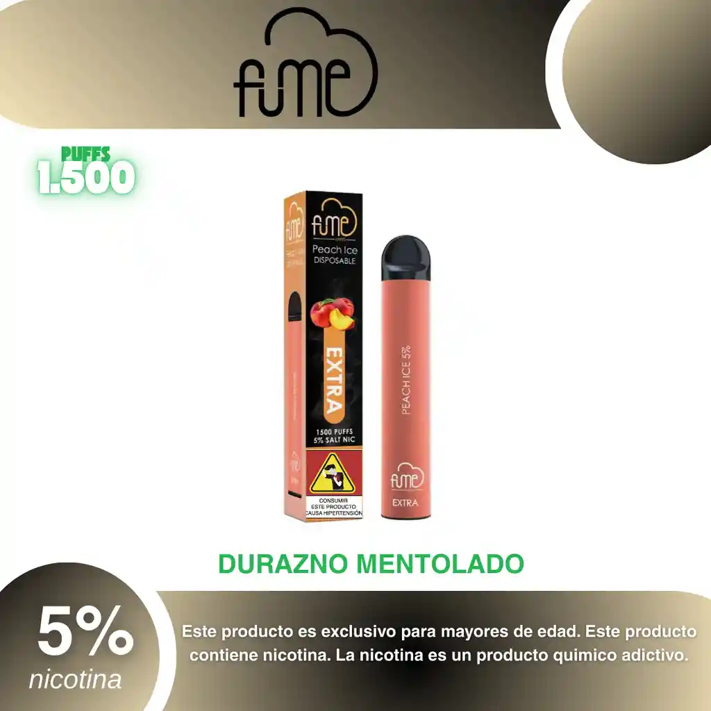 Fume Extra 1.500 Puffs, Sabor Durazno Mentolado. PROHIBIDA LA VENTA A MENORES DE EDAD. ADVERTENCIA: ESTE PRODUCTO CONTIENE NICOTINA, LA NICOTINA ES UNA SUSTANCIA QUIMICA ADICTIVA Y NOCIVA PARA LA SALUD. Los líquidos para vapeo contienen: propilenglicol USP, glicerina USP, sabor artificial y nicotina. Este producto puede contener nicotina, una sustancia altamente adictiva que puede generar dependencia, posibles afectaciones arteriales, cardiacas, pulmonares y otras aun no identificadas. No se recomienda su uso a mujeres en embarazo, puede generar lesiones al feto. Mantener alejado de niños y mascotas. No ingerir, puede generar irritación y/o intoxicación. Por favor antes de consumir consulte a su médico posibles afectaciones o sensibilidad a alguno de sus componentes. Los componentes de este producto pueden aumentar la sensación de ansiedad En caso de notar alguna reacción adversa por favor suspenda su uso de manera inmediata. Siga las instrucciones en el envase. No alterar sus componentes. Adquiera sus productos en sitios de confianza No use productos piratas, alterados, o en los cuales no pueda comprobar su buena procedencia, Verifique la reputación del fabricante y distribuidor antes de adquirir cualquier producto Si no es usuario fumador o vapeador no se recomienda su uso bajo ninguna circunstancia Al usar este producto usted es consciente que este producto puede generar afectaciones a su salud, incluyendo aquellas que a la fecha de la compra no se han identificado y que pueden aparecer a largo plazo.