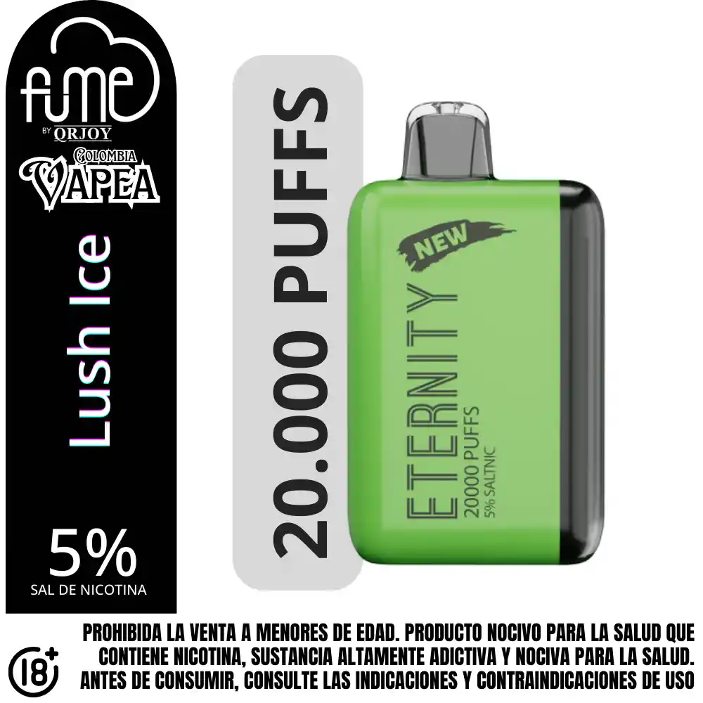 Vapeador Desechable marca Fume sabor a Lush Ice. Fuerza de nicotina: 5%. Sal de nicotina equivalente a aproximadamente 1 paquete de cigarrillos. Capacidad de la batería: 850 mAh. Número de bocanadas: hasta 20000 Puffs o caladas. Prohibida la venta a menores de edad. Producto nocivo para la salud que contiene nicotina, sustancia altamente adictiva. Antes de consumir consulte las indicaciones y contraindicaciones de uso.