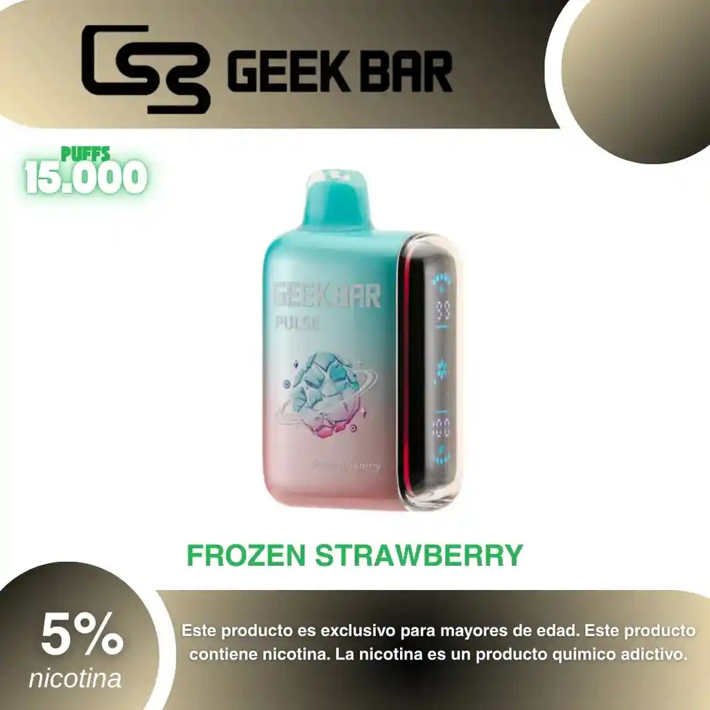 Geek Bar Pulse 15.000 Puffs, Sabor Fresa Mentolada 5% PROHIBIDA LA VENTA A MENORES DE EDAD. ADVERTENCIA: ESTE PRODUCTO CONTIENE NICOTINA, LA NICOTINA ES UNA SUSTANCIA QUIMICA ADICTIVA Y NOCIVA PARA LA SALUD. Los líquidos para vapeo contienen: propilenglicol USP, glicerina USP, sabor artificial y nicotina. Este producto puede contener nicotina, una sustancia altamente adictiva que puede generar dependencia, posibles afectaciones arteriales, cardiacas, pulmonares y otras aun no identificadas. No se recomienda su uso a mujeres en embarazo, puede generar lesiones al feto. Mantener alejado de niños y mascotas. No ingerir, puede generar irritación y/o intoxicación. Por favor antes de consumir consulte a su médico posibles afectaciones o sensibilidad a alguno de sus componentes. Los componentes de este producto pueden aumentar la sensación de ansiedad En caso de notar alguna reacción adversa por favor suspenda su uso de manera inmediata. Siga las instrucciones en el envase. No alterar sus componentes. Adquiera sus productos en sitios de confianza No use productos piratas, alterados, o en los cuales no pueda comprobar su buena procedencia, Verifique la reputación del fabricante y distribuidor antes de adquirir cualquier producto Si no es usuario fumador o vapeador no se recomienda su uso bajo ninguna circunstancia Al usar este producto usted es consciente que este producto puede generar afectaciones a su salud, incluyendo aquellas que a la fecha de la compra no se han identificado y que pueden aparecer a largo plazo