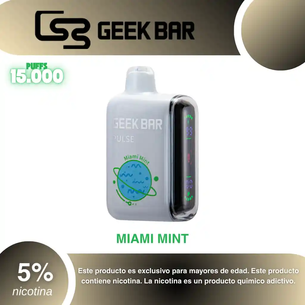 Geek Bar Pulse 15.000 Puffs, Sabor Menta 5% PROHIBIDA LA VENTA A MENORES DE EDAD. ADVERTENCIA: ESTE PRODUCTO CONTIENE NICOTINA, LA NICOTINA ES UNA SUSTANCIA QUIMICA ADICTIVA Y NOCIVA PARA LA SALUD. Los líquidos para vapeo contienen: propilenglicol USP, glicerina USP, sabor artificial y nicotina. Este producto puede contener nicotina, una sustancia altamente adictiva que puede generar dependencia, posibles afectaciones arteriales, cardiacas, pulmonares y otras aun no identificadas. No se recomienda su uso a mujeres en embarazo, puede generar lesiones al feto. Mantener alejado de niños y mascotas. No ingerir, puede generar irritación y/o intoxicación. Por favor antes de consumir consulte a su médico posibles afectaciones o sensibilidad a alguno de sus componentes. Los componentes de este producto pueden aumentar la sensación de ansiedad En caso de notar alguna reacción adversa por favor suspenda su uso de manera inmediata. Siga las instrucciones en el envase. No alterar sus componentes. Adquiera sus productos en sitios de confianza No use productos piratas, alterados, o en los cuales no pueda comprobar su buena procedencia, Verifique la reputación del fabricante y distribuidor antes de adquirir cualquier producto Si no es usuario fumador o vapeador no se recomienda su uso bajo ninguna circunstancia Al usar este producto usted es consciente que este producto puede generar afectaciones a su salud, incluyendo aquellas que a la fecha de la compra no se han identificado y que pueden aparecer a largo plazo