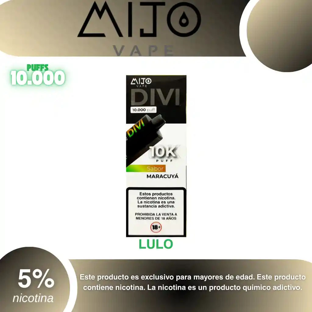 Vape Mijo Divi 10.000 Puffs Lulo 5% PROHIBIDA LA VENTA A MENORES DE EDAD. ADVERTENCIA: ESTE PRODUCTO CONTIENE NICOTINA, LA NICOTINA ES UNA SUSTANCIA QUIMICA ADICTIVA Y NOCIVA PARA LA SALUD. Los líquidos para vapeo contienen: propilenglicol USP, glicerina USP, sabor artificial y nicotina. Este producto puede contener nicotina, una sustancia altamente adictiva que puede generar dependencia, posibles afectaciones arteriales, cardiacas, pulmonares y otras aun no identificadas. No se recomienda su uso a mujeres en embarazo, puede generar lesiones al feto. Mantener alejado de niños y mascotas. No ingerir, puede generar irritación y/o intoxicación. Por favor antes de consumir consulte a su médico posibles afectaciones o sensibilidad a alguno de sus componentes. Los componentes de este producto pueden aumentar la sensación de ansiedad En caso de notar alguna reacción adversa por favor suspenda su uso de manera inmediata. Siga las instrucciones en el envase. No alterar sus componentes. Adquiera sus productos en sitios de confianza No use productos piratas, alterados, o en los cuales no pueda comprobar su buena procedencia, Verifique la reputación del fabricante y distribuidor antes de adquirir cualquier producto Si no es usuario fumador o vapeador no se recomienda su uso bajo ninguna circunstancia Al usar este producto usted es consciente que este producto puede generar afectaciones a su salud, incluyendo aquellas que a la fecha de la compra no se han identificado y que pueden aparecer a largo plazo