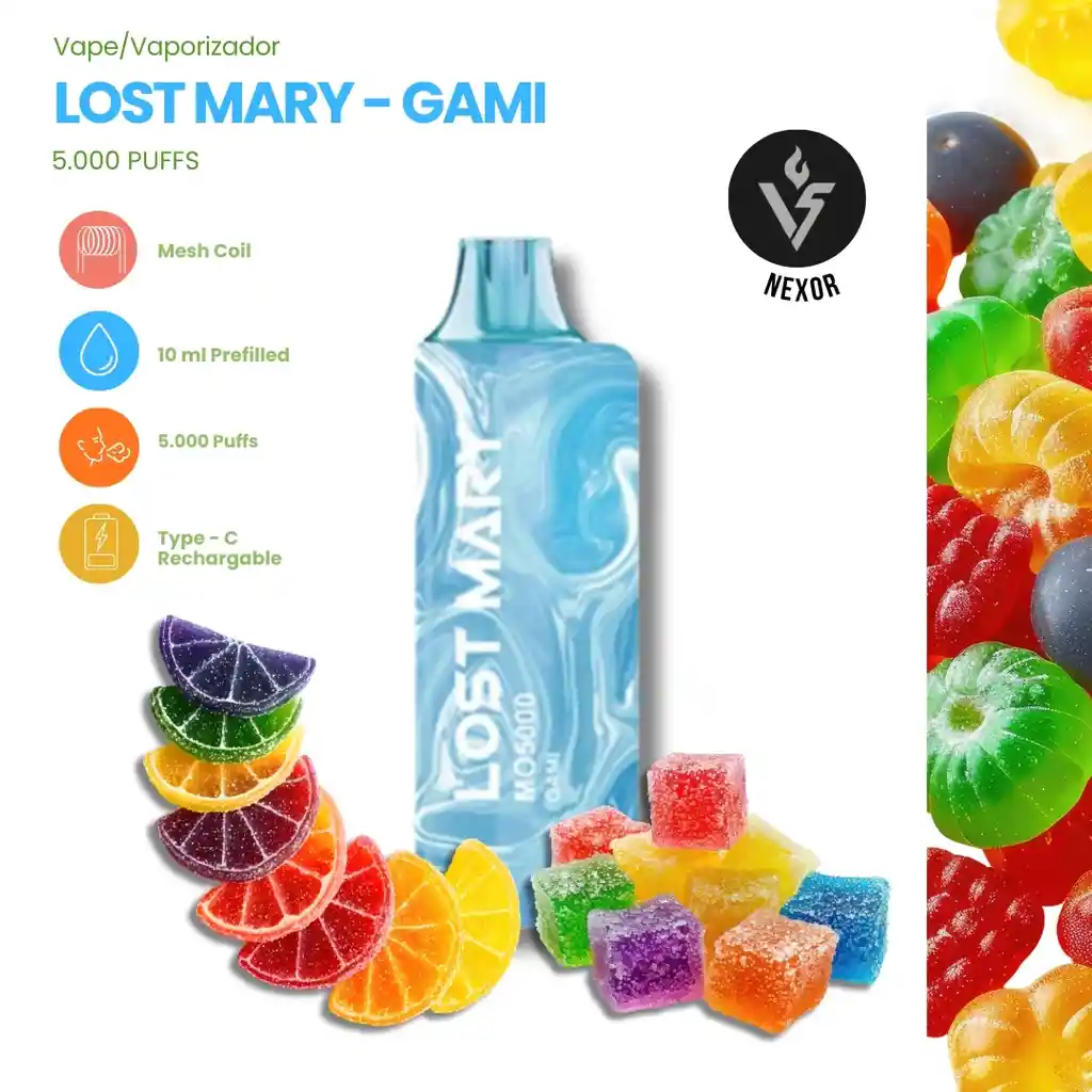 Déjate llevar por el sabor Gami del Lost Mary MO5000: una explosión de dulzura frutal inspirada en dulces japoneses, cada calada ofrece una sensación suave, intensa y deliciosa que envuelve tu paladar desde el primer instante. 🍬 Dulzura intensa y equilibrada — como ese caramelo favorito que no puedes dejar. 🍉 Notas frutales refrescantes, que hacen cada calada placentera y refrescante. 🌬️ Sensación suave y limpia, sin ese golpe áspero que arruina la experiencia.