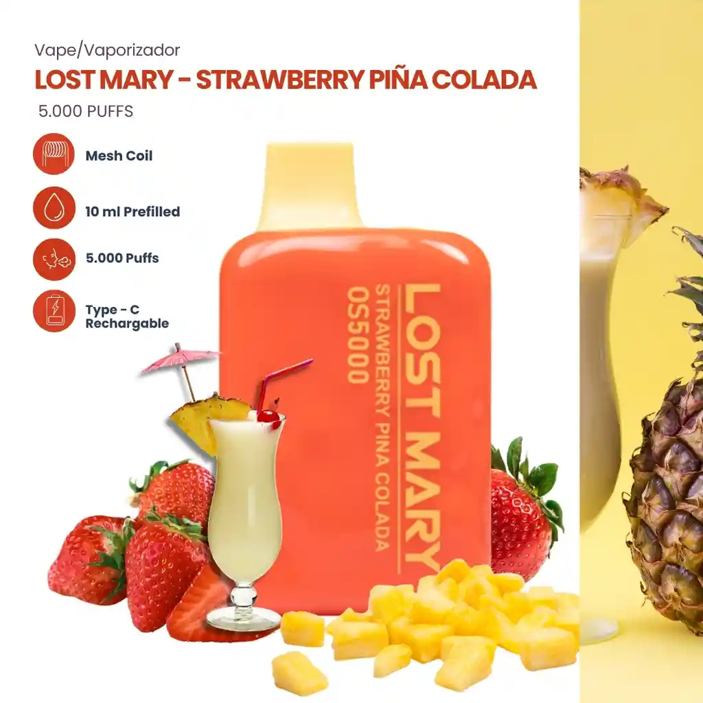 La dulzura de la fresa se mezcla con el sabor tropical de la piña colada para crear una experiencia cremosa, frutal y refrescante. Un sabor inspirado en el Caribe que transporta a un ambiente tropical en cada calada. Características principales: Hasta 5000 puffs Mesh Coil para mejor sabor y vapor Batería recargable Carga rápida Tipo-C Activación automática al inhalar Diseño compacto y fácil de transportar