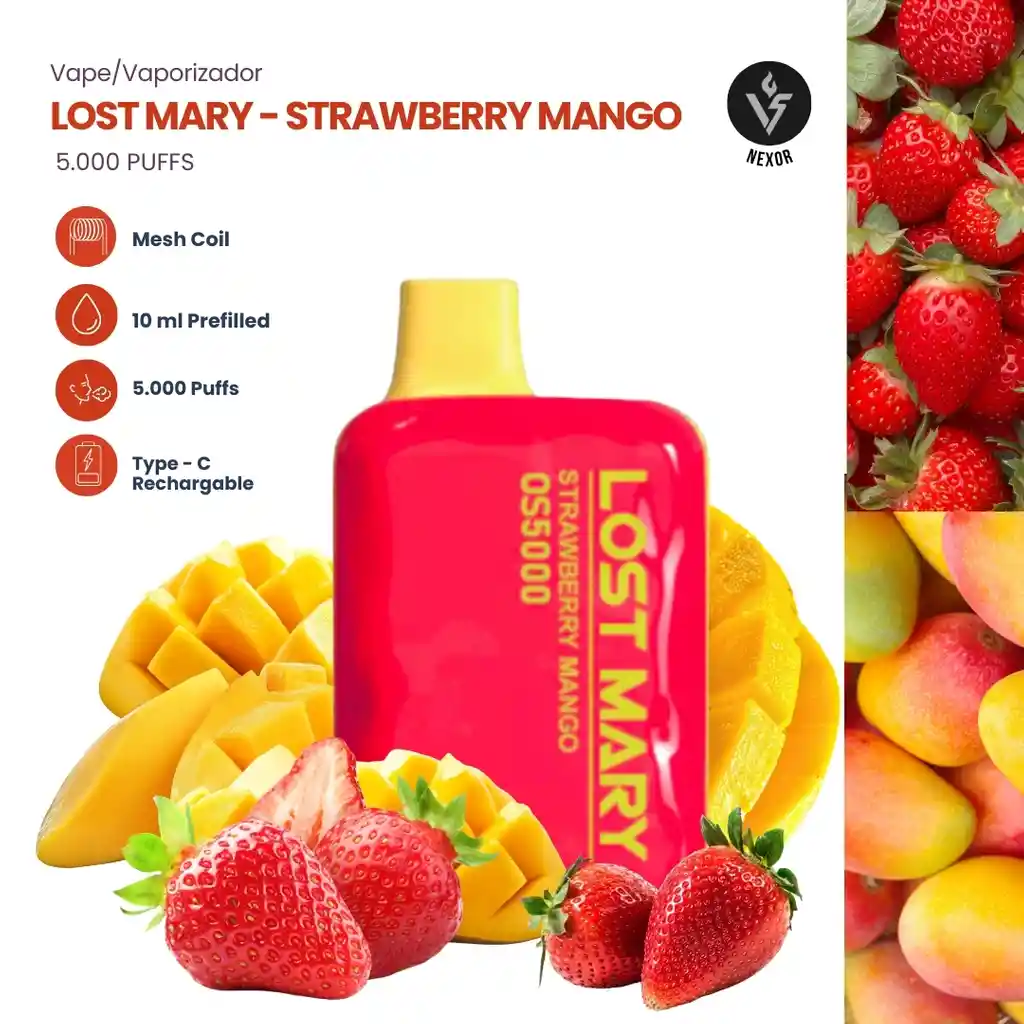 Una fusión tropical que combina la dulzura natural de la fresa con la jugosidad del mango maduro. El resultado es un sabor frutal, exótico y equilibrado que ofrece una experiencia suave, dulce y muy refrescante. Características principales: Hasta 5000 puffs Mesh Coil para mejor sabor y vapor Batería recargable Carga rápida Tipo-C Activación automática al inhalar Diseño compacto y fácil de transportar