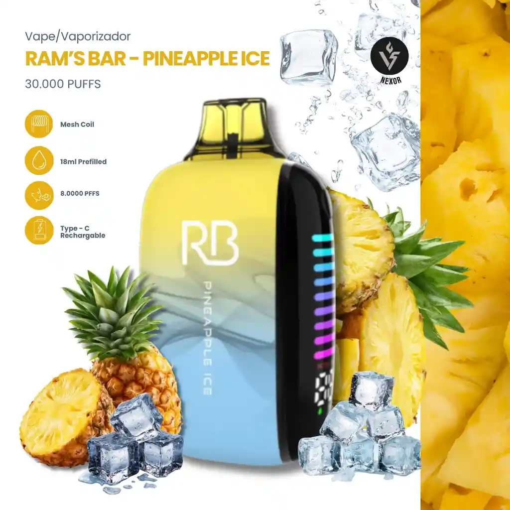 Un sabor tropical intenso que combina la dulzura jugosa de la piña madura con un toque ácido ligero que despierta el paladar. Desde la primera calada sientes esa explosión frutal brillante y natural, seguida de un efecto ice que enfría la garganta y deja una sensación súper refrescante. Características: • 30 ml de e-liquid prellenado • 850 mAh recargable • Carga rápida tipo C • Mesh coil (resistencia de malla) • Flujo de aire ajustable 👉 Calada más suave o más fuerte • Modo normal / modo boost • Hasta 30.000 puffs en modo normal • Modo Boost: ~15.000 puffs 👉 Puedes elegir entre duración o potencia • Pantalla LED 👉 Muestra batería y nivel de líquido • Activación automática (sin botones) 👉 Solo inhalas y listo